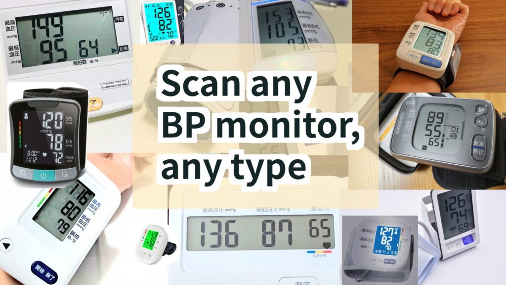 Blood pressure monitors that display systolic, diastolic, and pulse values using digital numbers (7-segment digits made of 7 bars) can be scanned, regardless of brand or model. Both upper arm and wrist types are supported.