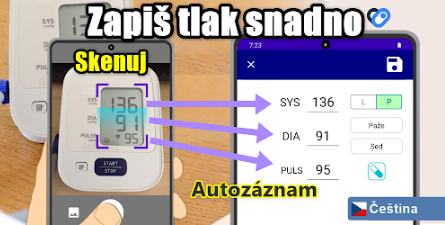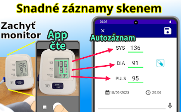 Místo ručního zadávání čísel můžete naskenovat digitální displej vašeho tlakoměru pomocí fotoaparátu telefonu. Aplikace automaticky přečte hodnoty na obrazovce a zaznamená systolický tlak, diastolický tlak a puls. Tato funkce OCR funguje s mnoha digitálními tlakoměry.