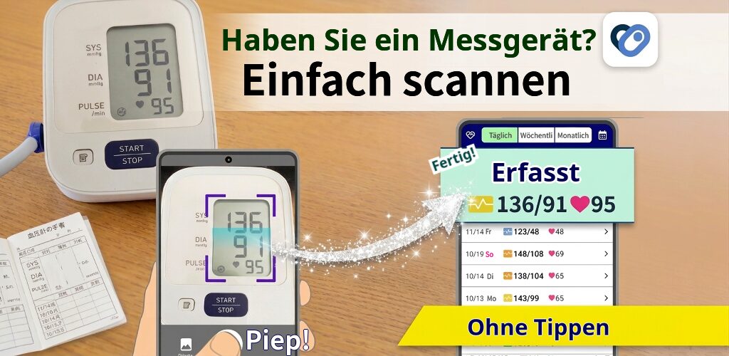 Keine manuelle Eingabe für die Blutdruckaufzeichnung erforderlich! Scannen Sie einfach Ihr Blutdruckmessgerät, um es automatisch zu erfassen!