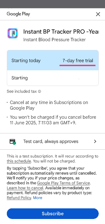 the Google Play confirmation screen will show “Starting Today 7-day free trial” if the free trial is available.