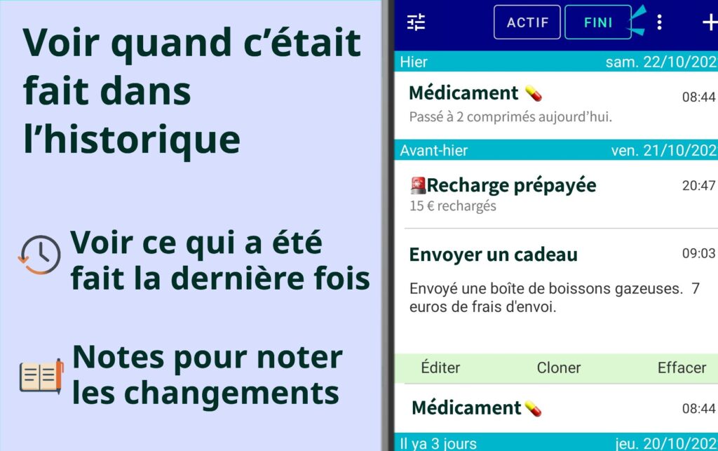 - Les entrées d’historique passées peuvent être dupliquées et rapidement définies à nouveau comme de nouveaux rappels