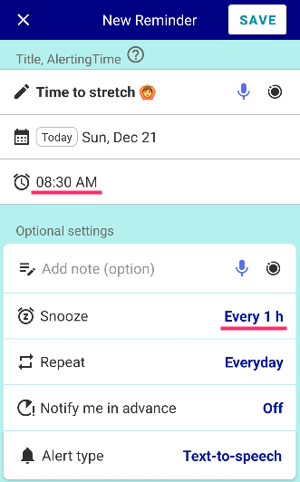 - Voice readout: Reads the reminder title aloud, such as “Let’s take a break”