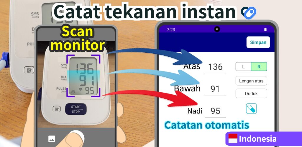 Tidak perlu memasukkan data secara manual untuk mencatat tekanan darah Anda! Cukup pindai pengukur tekanan darah Anda untuk mencatatnya secara otomatis!