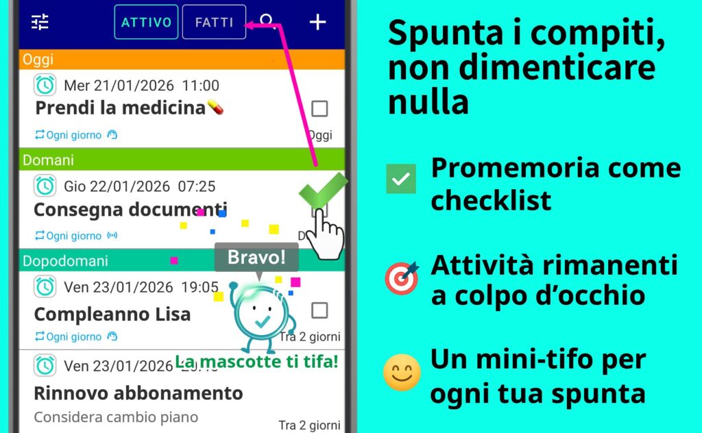 I compiti sono visualizzati come una checklist in ordine cronologico, rendendo facile vedere cosa è ancora incompiuto e cosa sta per arrivare. - Un personaggio carino esulta ogni volta che spunti un compito