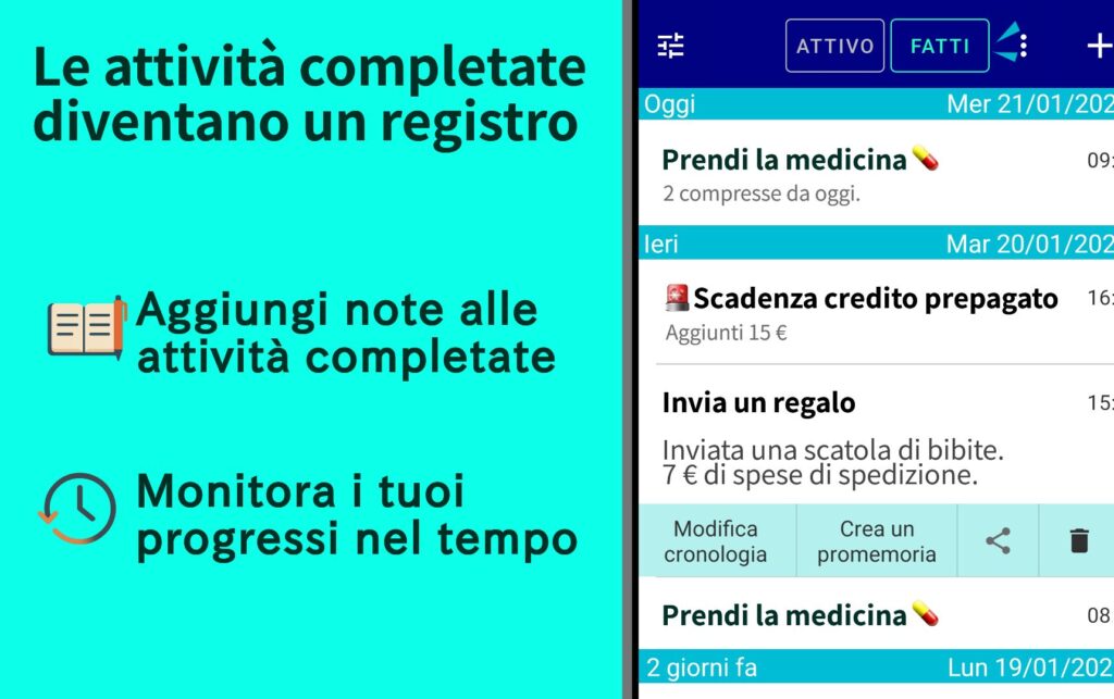 - Quando contrassegni un promemoria come completato ✅, viene automaticamente salvato nella tua cronologia attività
