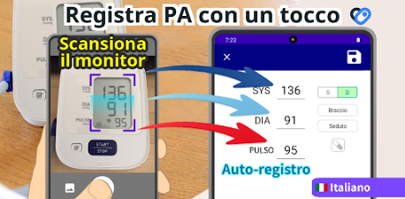 Invece di digitare manualmente i numeri, puoi scansionare il display digitale del tuo misuratore di pressione sanguigna utilizzando la fotocamera del tuo telefono. L’app legge i valori sullo schermo e registra automaticamente la pressione sistolica, la pressione diastolica e il polso. Questa funzione OCR funziona con molti misuratori di pressione sanguigna digitali.