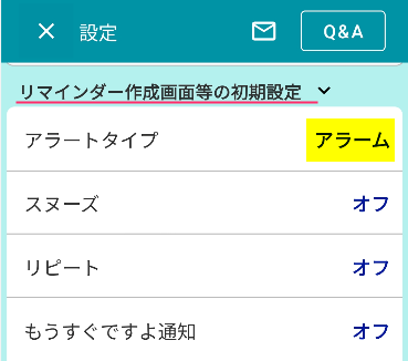 設定→リマインダー作成画面等の初期設定→アラートタイプへ。