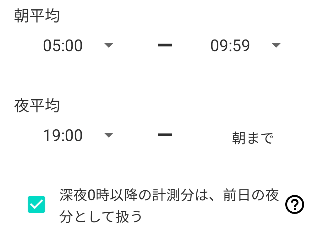 何時から何時までを朝平均、夜平均として含めるかを調整する事ができます。