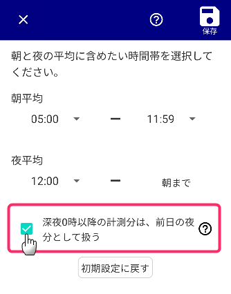「設定」→「朝夜平均時間と、深夜0時以降の設定」へ![]()