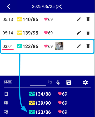 この画像のように、深夜3時に測った記録は、夜平均に加えられます。