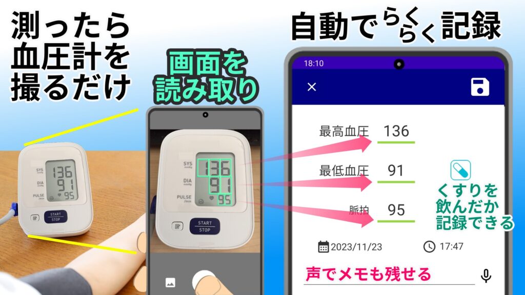 - 血圧計の画面をカメラで読み取るだけで数値を記録