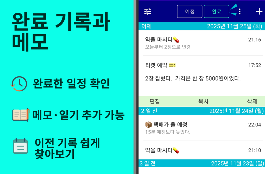 - 과거 기록을 복제해 새 리마인더로 빠르게 다시 설정할 수 있습니다