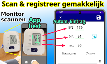 In plaats van handmatig getallen in te typen, kun je het digitale display van je bloeddrukmeter scannen met de camera van je telefoon. De app leest de waarden op het scherm en registreert automatisch de systolische druk, diastolische druk en pols. Deze OCR-functie werkt met veel digitale bloeddrukmeters.