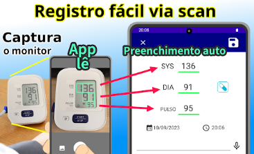 Em vez de digitar os números manualmente, você pode escanear o visor digital do seu medidor de pressão usando a câmera do telefone. O aplicativo lê os valores exibidos na tela e registra automaticamente a pressão sistólica, a pressão diastólica e o pulso. Esse recurso de OCR funciona com muitos medidores de pressão digitais.