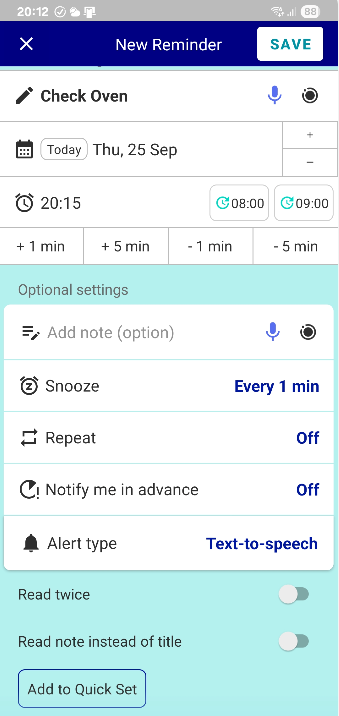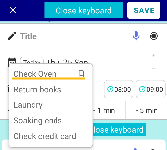 Next time, the Quick Set you registered will appear in the title input suggestions.By selecting this, the items you chose at registration (snooze, repeat, etc.) will be automatically filled in.