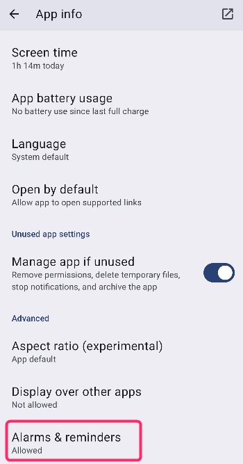 If you have already set the app to “Unrestricted” in battery optimization, the “Alarms & reminders” permission is generally enabled automatically. If you wish to manually toggle the “Alarms & reminders” switch, set the app back to “Optimized” once, and the item will reappear.
