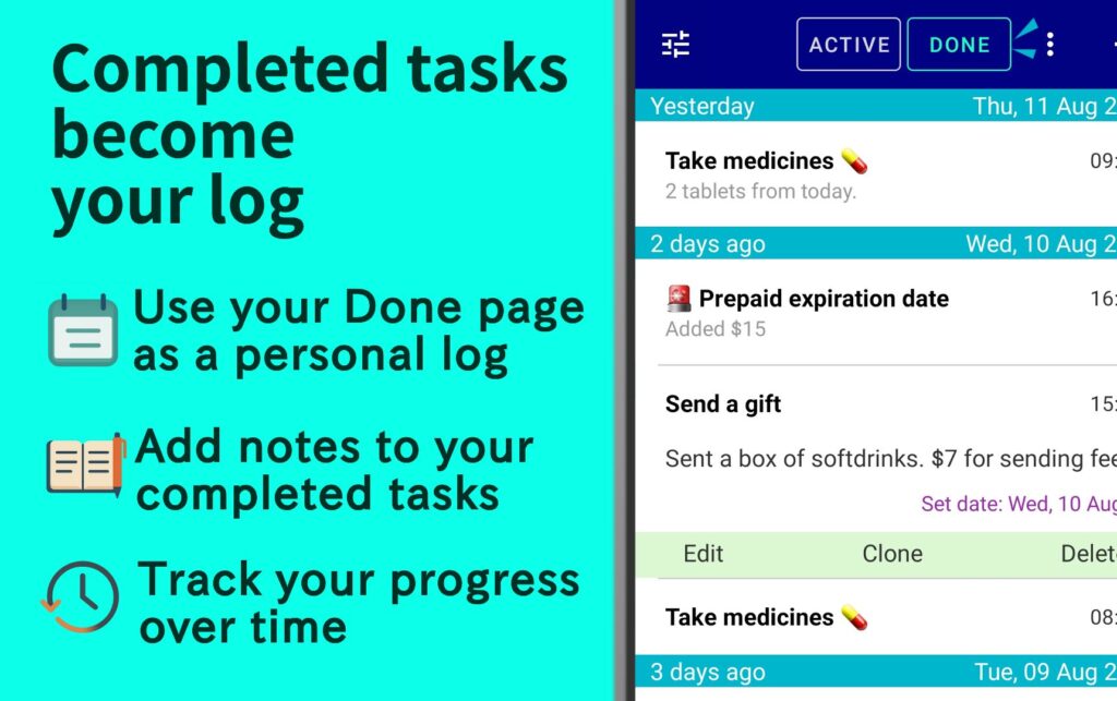 Completed tasks are saved in chronological order, so you can check them later at a glance.