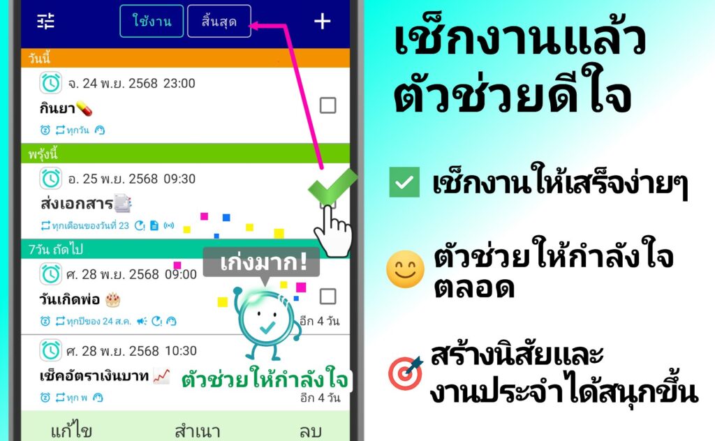 เมื่อคุณเช็กงานที่ทำเสร็จแล้ว ✅️ งานนั้นจะหายไปอย่างสะใจ และตัวละครน่ารักจะกระโดดออกมาชื่นชมคุณ ความรู้สึกสำเร็จนี้ทำให้ติดใจ - ดีไซน์สีสันสดใส อ่านง่าย