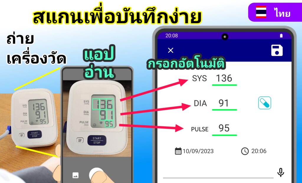 บันทึกค่าโดยอัตโนมัติด้วยการสแกนเครื่องวัดความดันโลหิตของคุณ
