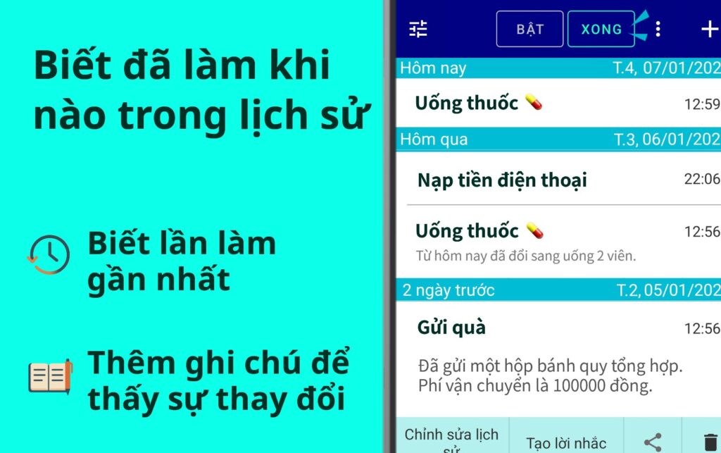 - Ngay cả khi không đặt lời nhắc, bạn có thể trực tiếp thêm ghi chú hoặc mục nhật ký vào lịch sử