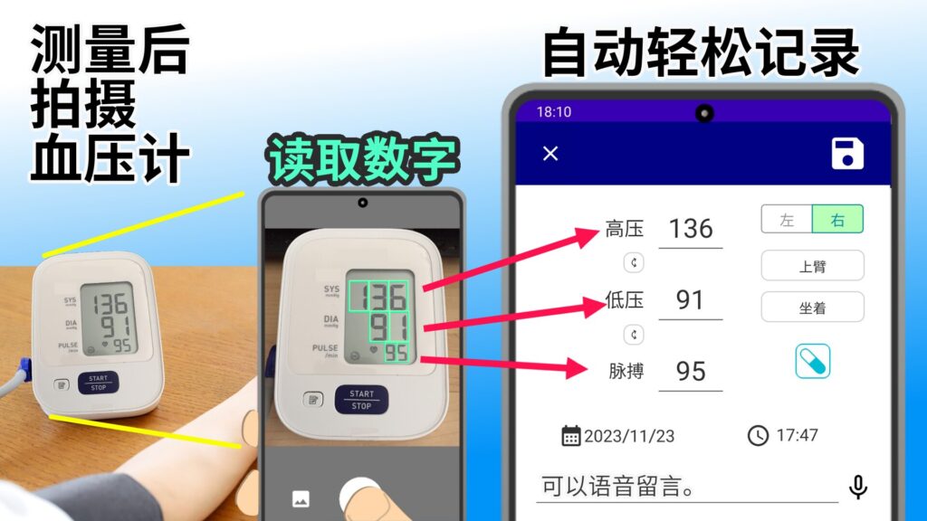 - 只需用相机扫描您的血压计显示屏即可记录读数